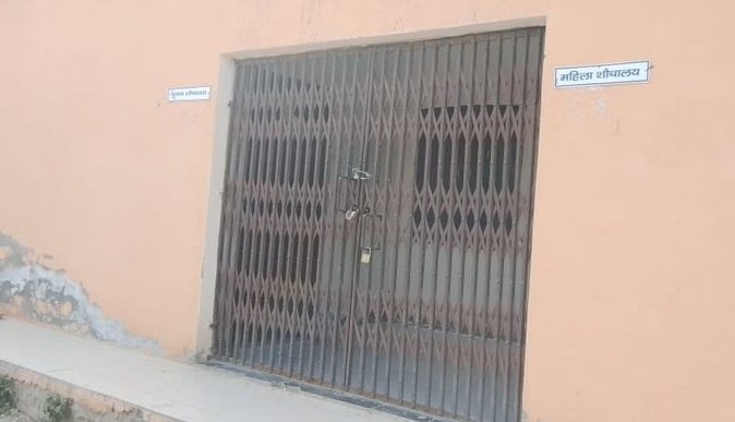 अनाज मंडी में बने सुलभ शौचालय के मुख्य गेट पर लटका ताला।