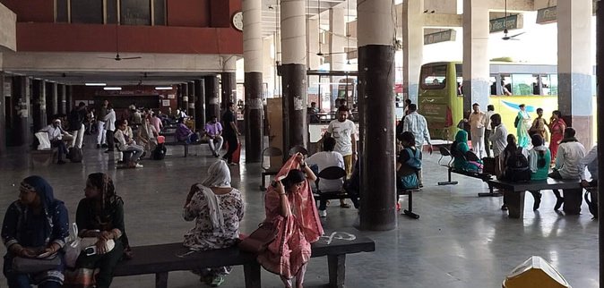 सामान्य बस स्टैंड पर बसों का इंतजार करते यात्री।