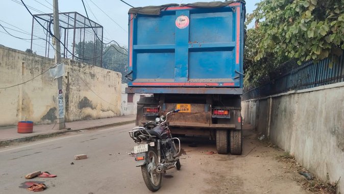 सड़क पर खड़ा डंपर और बाइक।