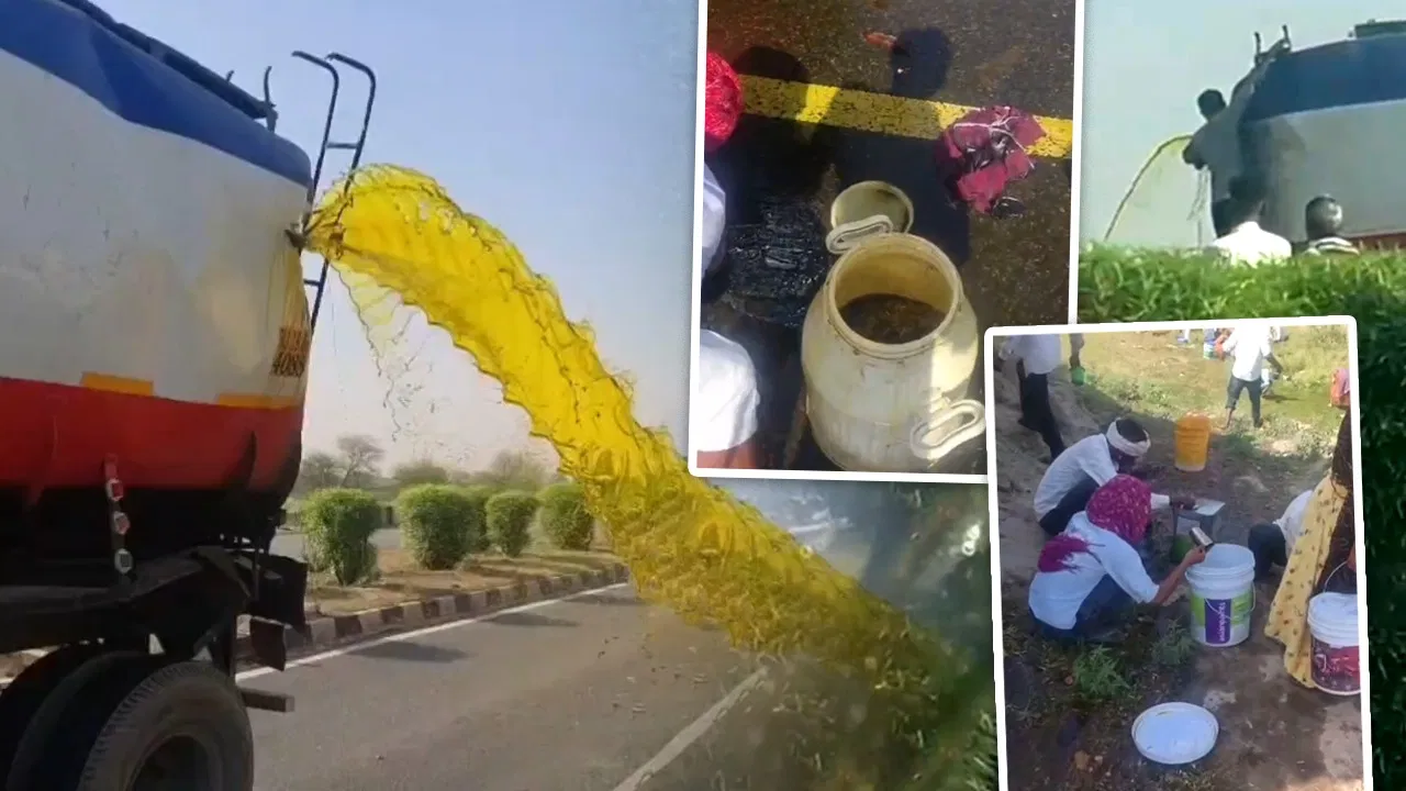 राजस्थान के टोंक में NH-52 पर ट्रक और टैंकर की भिड़ंत। टैंकर से बहते सरसों के तेल को लूटने के लिए बाल्टी-डिब्बे लेकर उमड़े ग्रामीण। पुलिस ने कड़ी मशक्कत से हटाया।