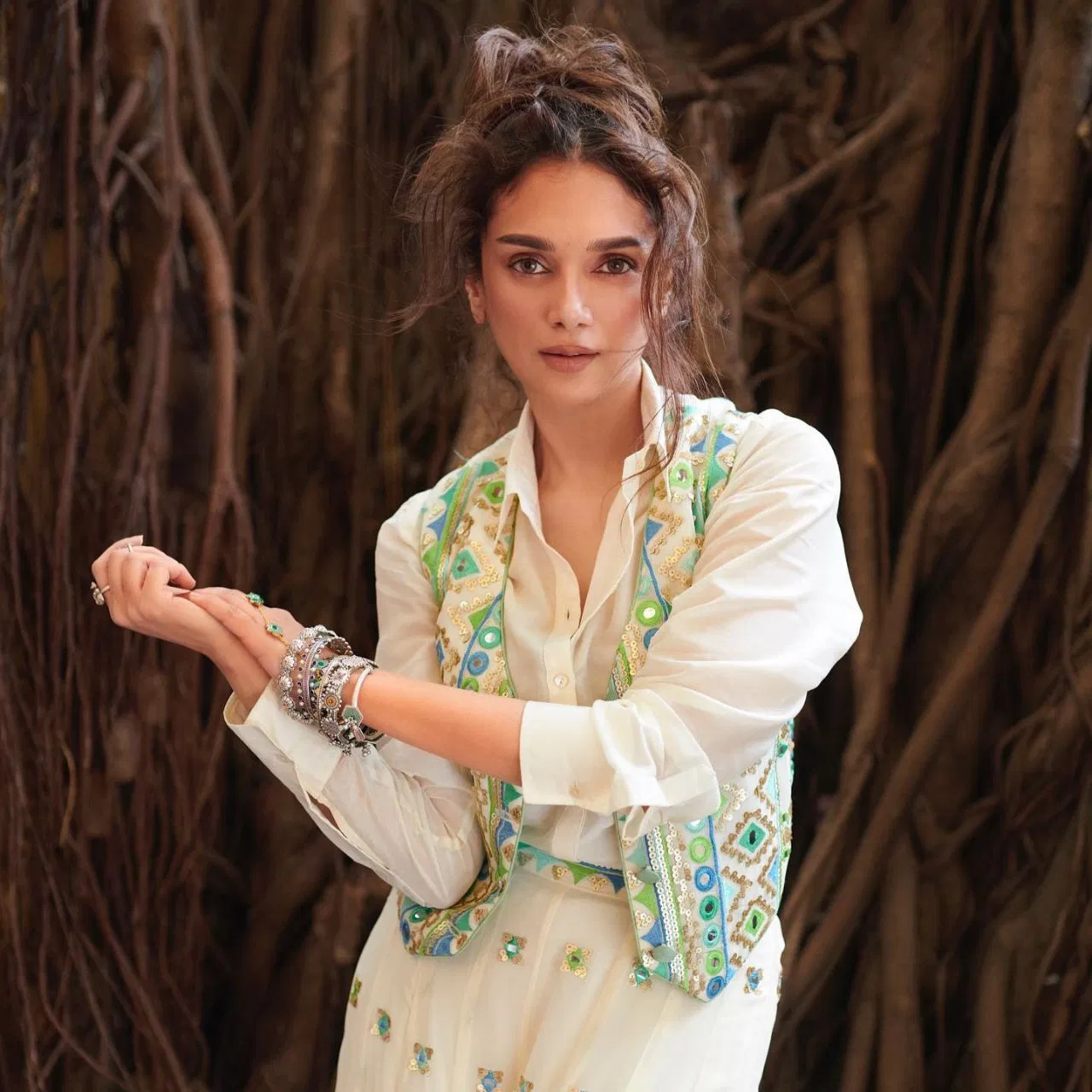 अदिति राव हैदरी का ये लुक भी काफी फ्लॉलेस और ब्लूमिंग टच वाला है. एक्ट्रेस ने वाइट कलर की शर्ट के साथ पेस्टल कलर कॉम्बिनेशन वाला रेशम वर्क कटस्लीव बेस कोट कैरी किया है, जिसमें मिरर वर्क भी किया गया है. अपने इस लुक को कंप्लीट करने के लिए उन्होंने सिल्वर ज्वेलरी कैरी की है, जिसमें एंटीक डिटेलिंग है. आप भी इस तरह का देसी फ्यूजन लुक स्प्रिंग सीजन में क्रिएट कर सकती हैं.