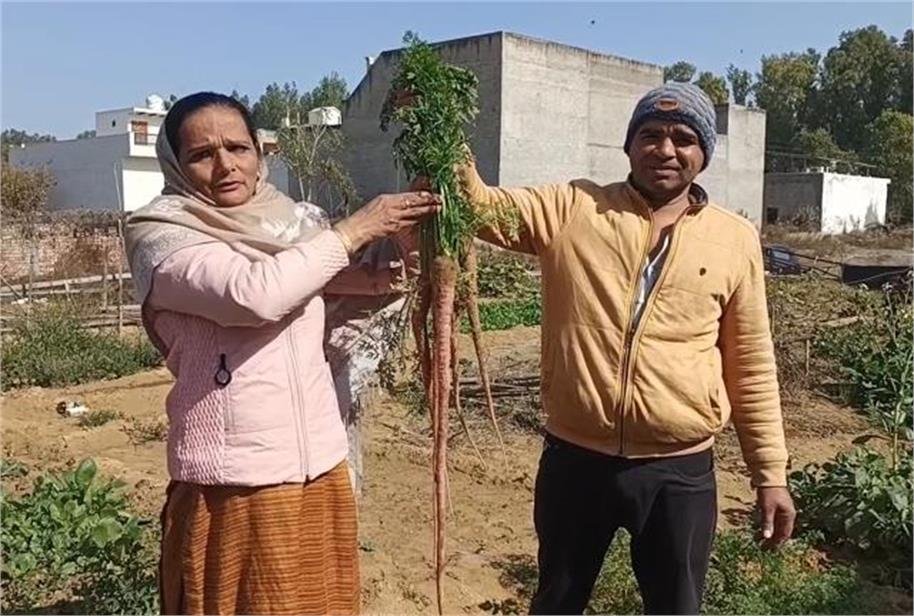 जुलाना : जुलाना कस्बे के वार्ड नंबर-1 निवासी कविता का बगिया के प्रति शौक अब पूरे क्षेत्र में चर्चा का विषय बना हुआ है। कविता ने अपने घर के आगे खाली पड़ी जमीन को सब्जियों की छोटी-सी बगिया में तब्दील कर दिया है, जहां वह पूरी तरह ऑर्गेनिक सब्जियां उगा रही हैं। खास बात यह है कि इस बार उनकी बगिया में लगभग 3 फीट लंबी गाजर उगी है, जिसे देखकर हर कोई हैरान है।